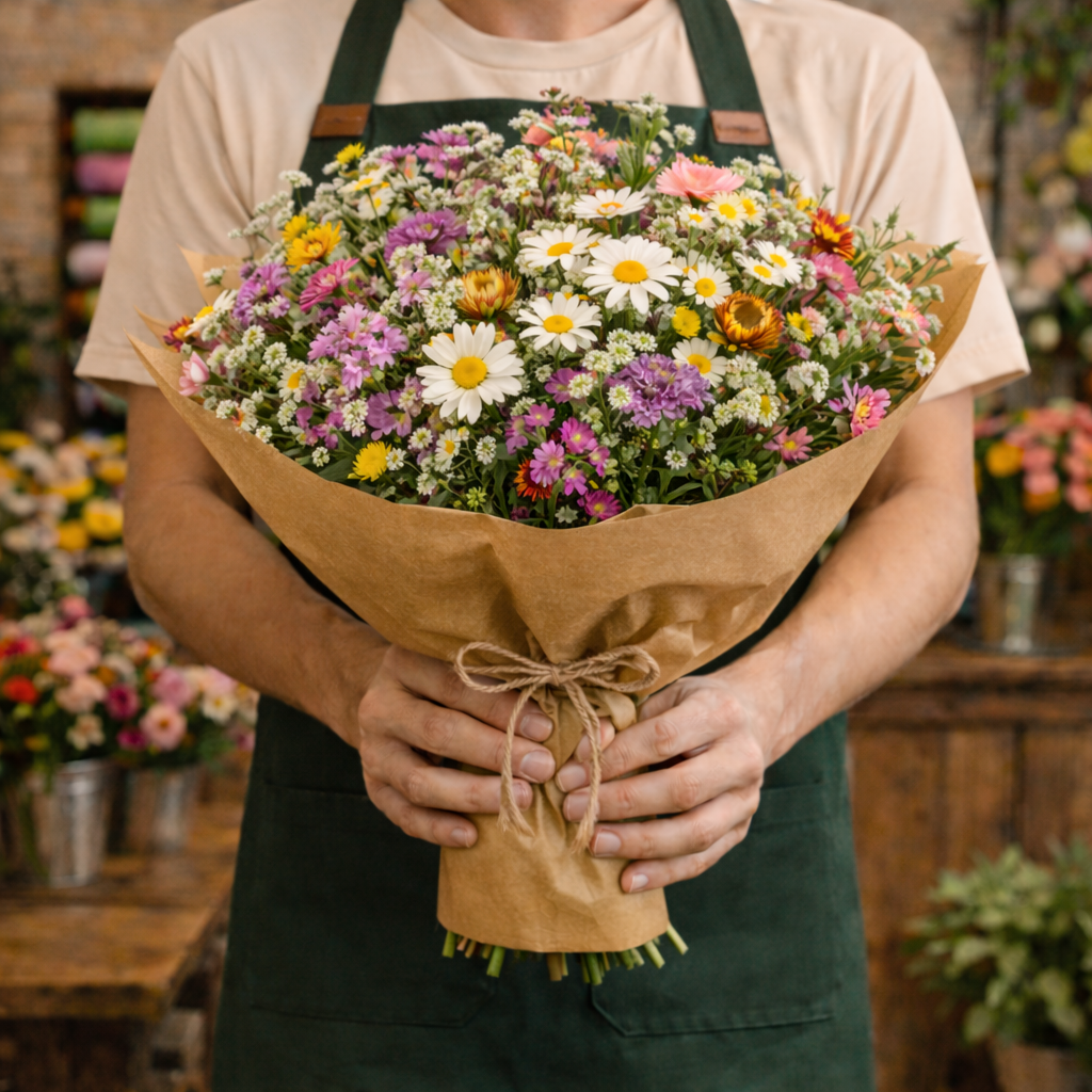 Flores do Campo – Grande com mix de flores coloridas, montagem artística e folhagens selecionadas.